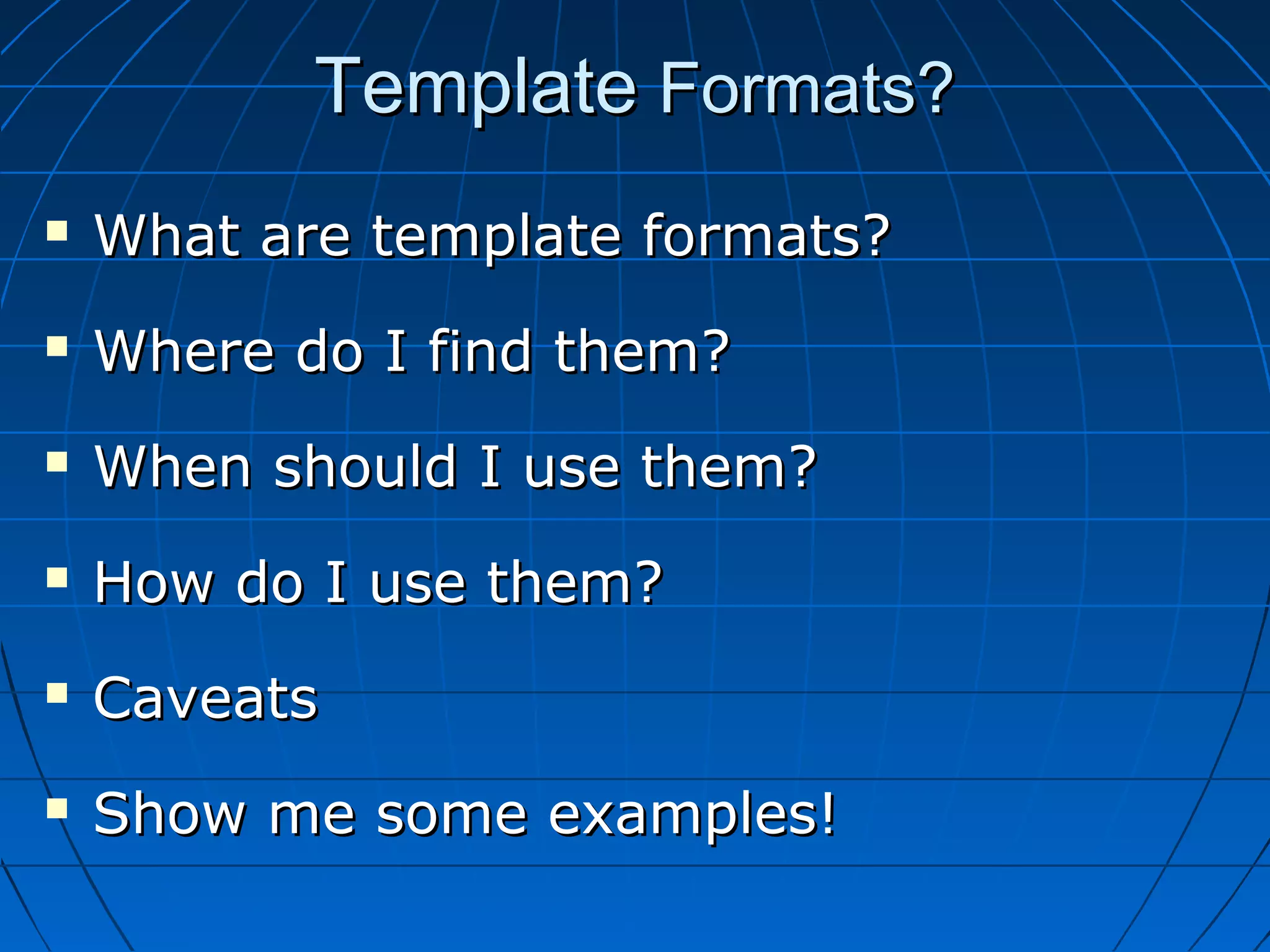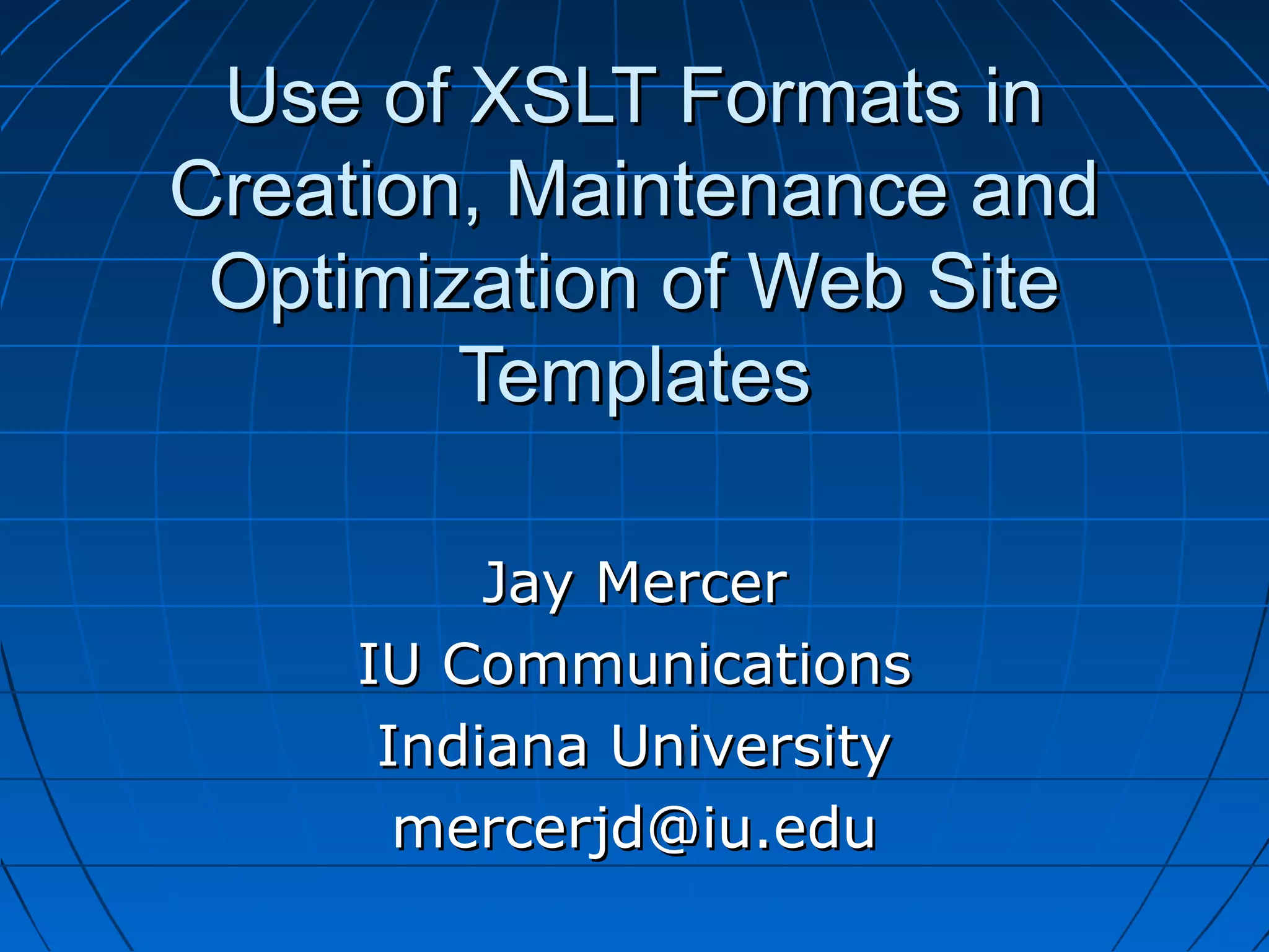 The document discusses the use of XSLT formats for creating, maintaining, and optimizing website templates at Indiana University. It covers the definition of template formats, where to find them, their applications, usage instructions, and notable caveats related to doctype and namespacing. Additionally, it includes examples to illustrate the transformation and manipulation of XHTML using these formats.