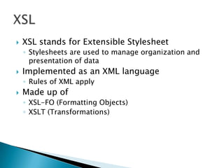 This document provides an overview of XSL (eXtensible Stylesheet Language), which is used to transform and present XML documents. It discusses that XSL is made up of XSLT for transformations and XSL-FO for formatting. XSLT is a declarative language that describes the results of transforming an XML document rather than the steps. The document also outlines the basic process of applying XSL transformations using a stylesheet to match nodes and templates.