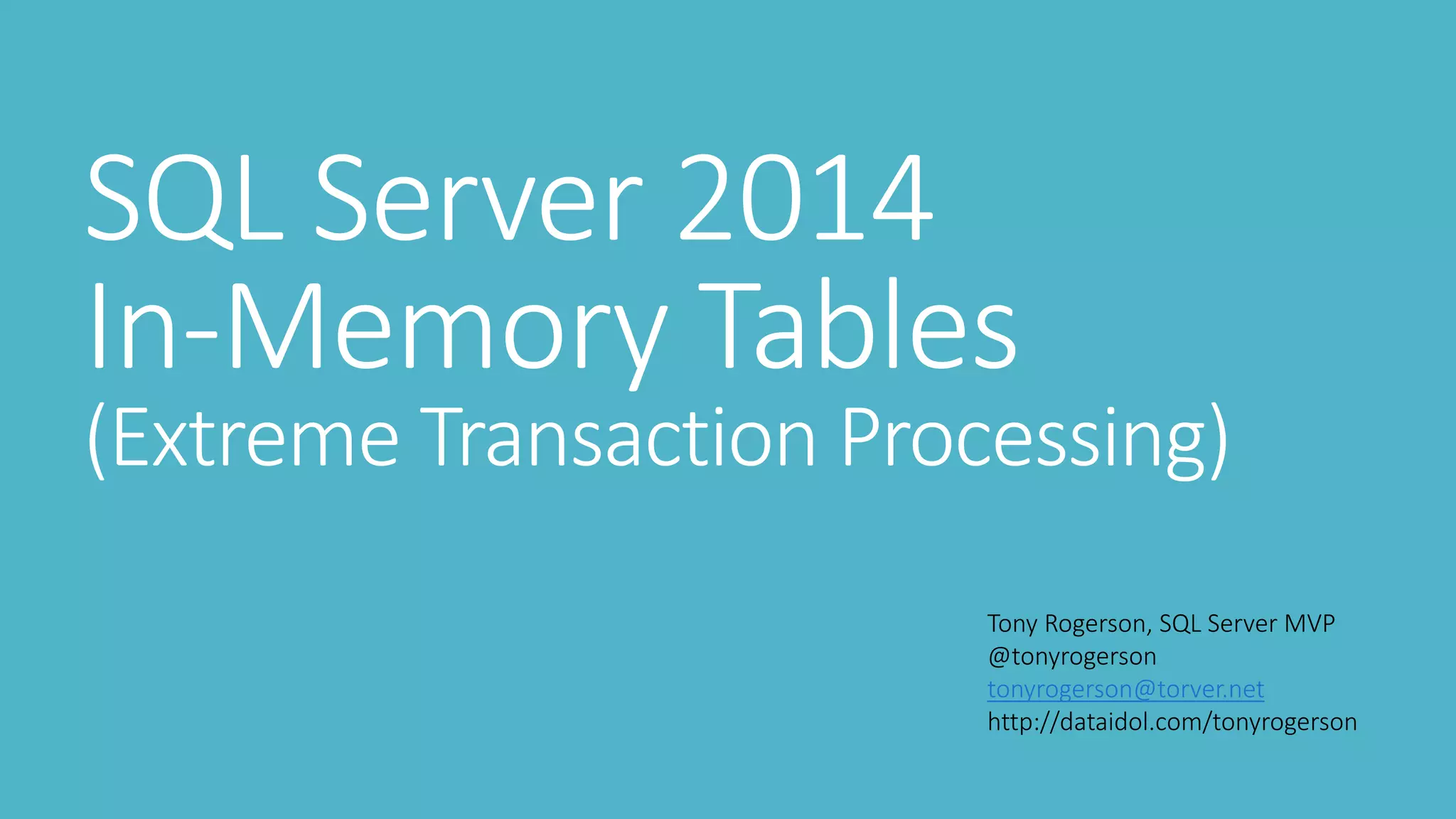 The document discusses SQL Server 2014 in-memory tables and technologies, focusing on their applications in extreme transaction processing. It covers various features such as hash indexing, durability settings, multi-version concurrency control (MVCC), and native compilation, highlighting the advantages of in-memory databases in terms of performance and efficiency. Additionally, it provides implementation ideas for leveraging in-memory tables while managing durability and transaction logging.