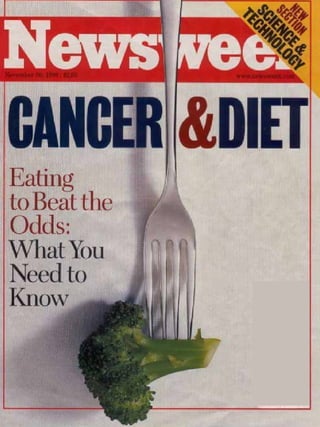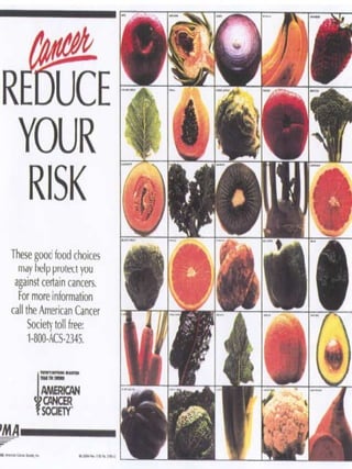 The document provides information on how to improve health through diet and lifestyle changes. It recommends eating a whole foods diet high in fruits and vegetables while limiting "bad" foods like sugar, processed foods, and unhealthy fats. Regular exercise is also emphasized along with reducing stress and drinking enough water. The overall message is that making these lifestyle changes can help reduce the risks of diseases like cancer, heart disease, diabetes, and more.