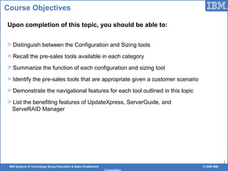 This document provides an overview and instructions for using IBM's configuration, sizing, and systems management tools for pre-sales support. It outlines tools for configuring System x, BladeCenter, and Storage solutions including the Standalone Solution Configuration Tool, eConfig, Hardware Configurator, and Advanced Solution Integration Tool. Sizing tools covered are the Power Configurator, Sizing Guides, and Workload Estimator. Systems management tools discussed are UpdateXpress, ServerGuide, and ServeRAID Manager. The presentation aims to help sales personnel distinguish between the different tool categories and select the appropriate tools for various customer scenarios.