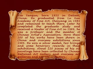 Xue Yanqun was born in 1953 in Dalian, China. He graduated from Lu Xun Academy of Fine Art in Shenyang in 1981 and later received his Master of Fine Arts degree in 1989. He has had his works shown in over 200 exhibitions in China and overseas since 1984, winning several medals and honors. More than 220 of his oil paintings are in the collections of the Chinese National Art Gallery and other galleries and private collectors.