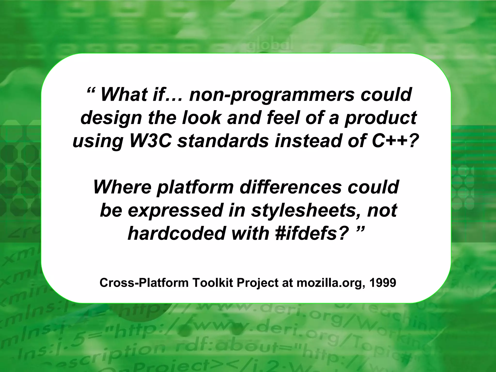 The document discusses the XUL (XML User Interface Language), a cross-platform toolkit developed by Mozilla, enabling non-programmers to design user interfaces using W3C standards instead of traditional programming languages. It outlines the components of XUL, including widgets, controls, and data handling through RDF, as well as the architecture of Mozilla applications. The document also provides examples and links to resources for further learning and development of XUL applications.