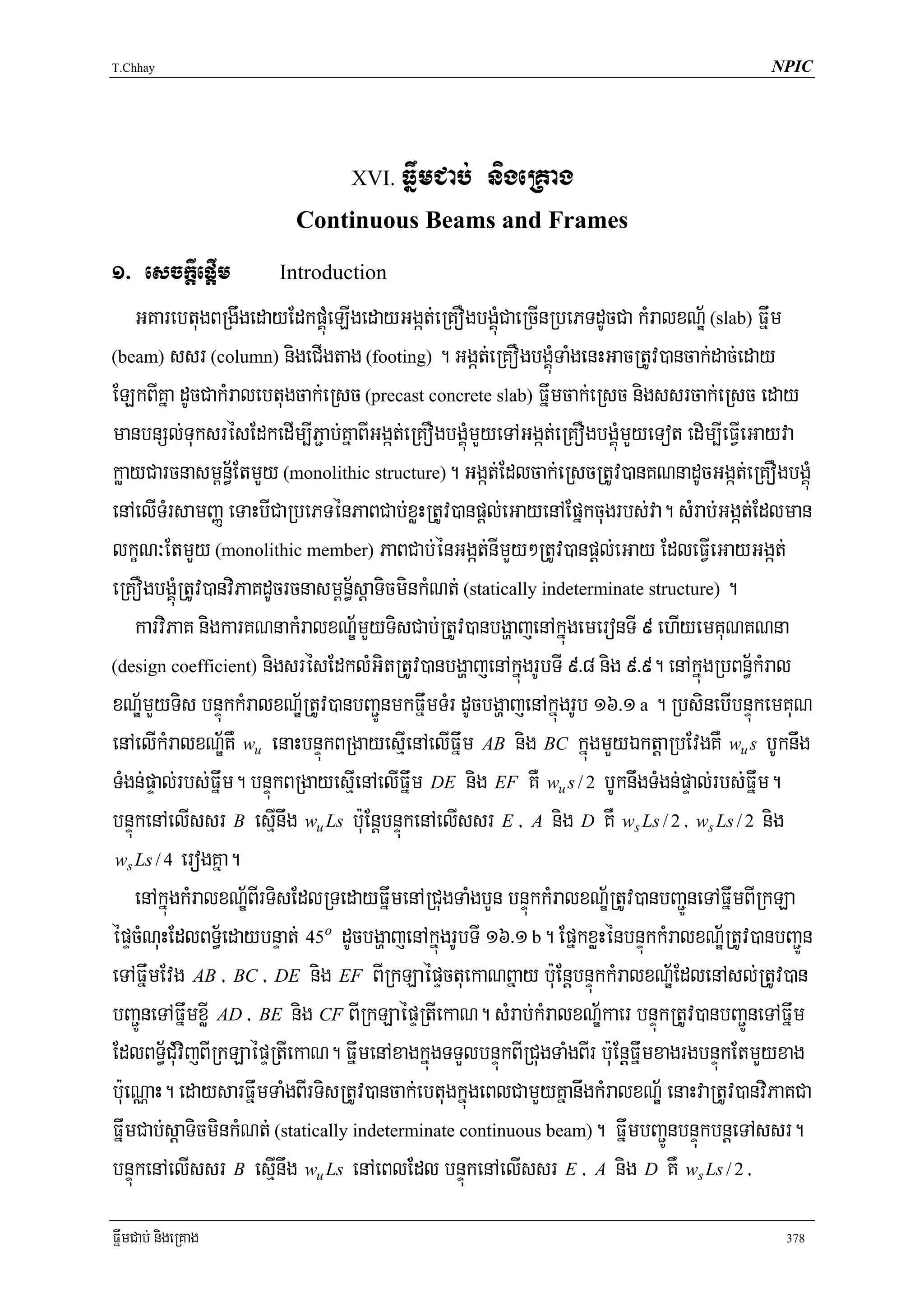 1. This document discusses continuous beams and frames, which are structural elements made of concrete slabs, beams, columns, and footings that are monolithically connected.