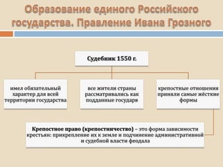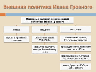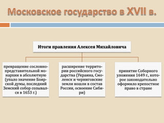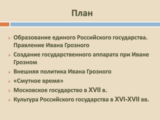 Документ представляет собой обзор ключевых событий и процессов в истории России в XVI-XVII веках, включая правление Ивана Грозного, создание государственного аппарата, внешнюю политику, а также «смутное время». В нем подчеркивается укрепление самодержавия, борьба с боярством, влияние опричнины, а также расширение территорий через военные завоевания и политические интриги. Особое внимание уделяется культурным изменениям, постепенному отходу от византийских традиций и началу западноевропейского влияния.