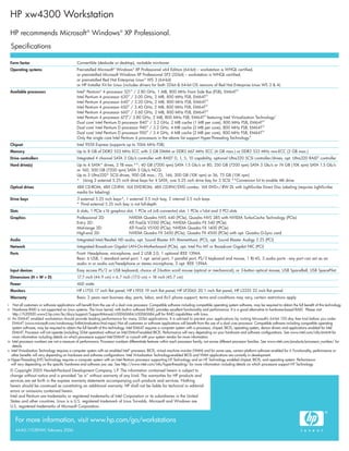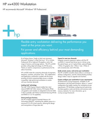 The document summarizes the HP xw4300 workstation. It can be configured with various Intel processors, operating systems, graphics cards, memory, and storage options. It provides high performance for engineering, design, and other demanding applications at an affordable price compared to other workstations. It has upgradeable components and tools to optimize performance for specific workloads.