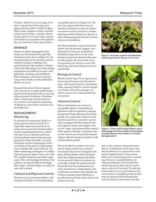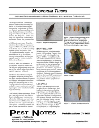The myoporum thrips is an invasive pest from New Zealand that is damaging and killing Myoporum plants in California landscapes. It feeds and lives within curled and distorted new growth of susceptible Myoporum species. Monitoring for females on new growth and tapping or shaking plants are effective detection methods. While beneficial insects help control the pest, severe infestations require systemic insecticides. Applying dinotefuran around tree trunks can control the thrips without harming other plants or beneficials as much as other application methods.