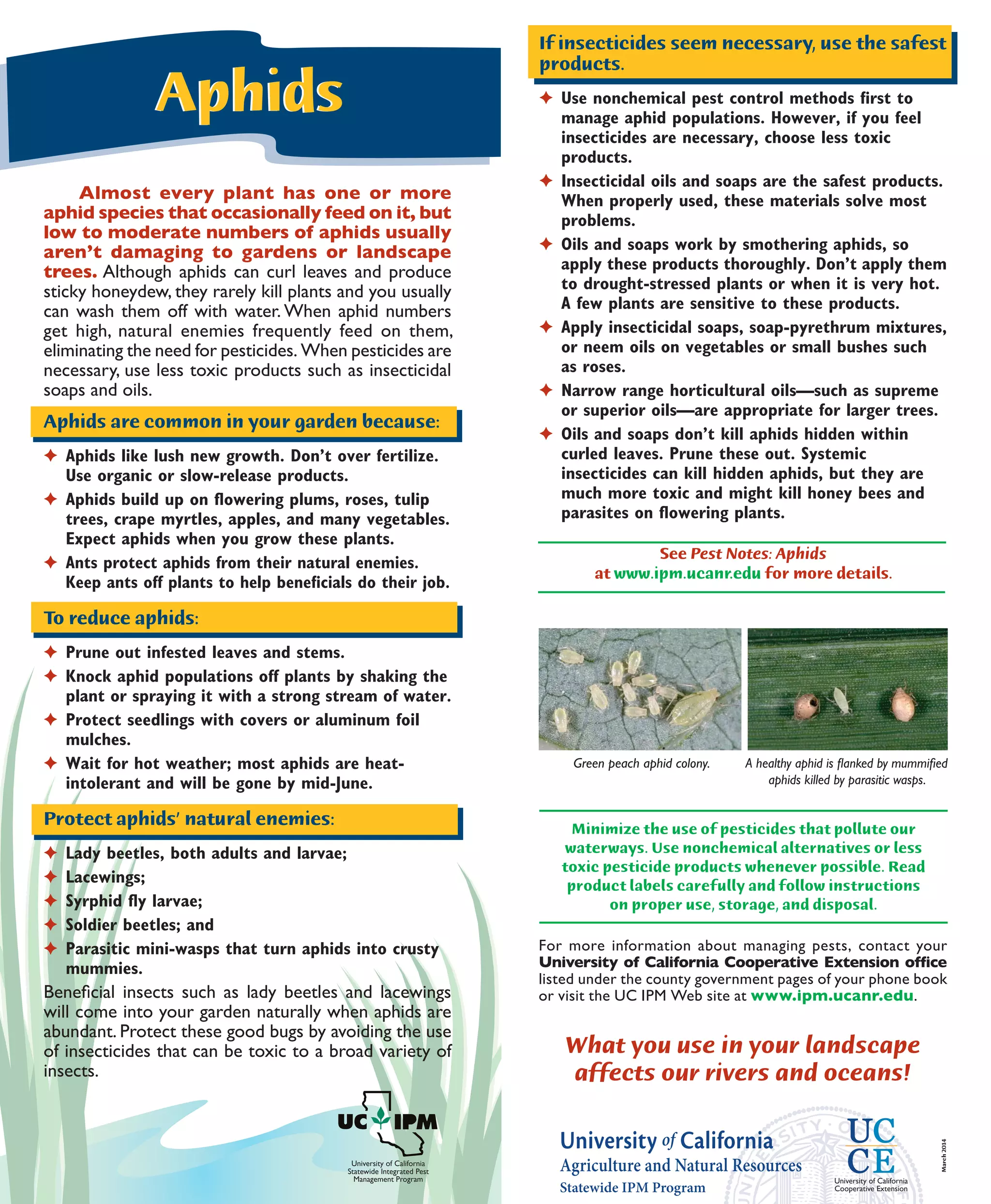 Aphids are common insects that feed on many garden and landscape plants. In low or moderate numbers, aphids do not significantly damage plants and can often be washed away with water. When aphid populations increase, natural predators like ladybugs and lacewings will feed on them, reducing the need for pesticides. Non-chemical methods like pruning infested plant parts and using high-pressure water sprays can help control aphid numbers. If pesticides are needed, soaps and oils are safer options that work by smothering aphids.
