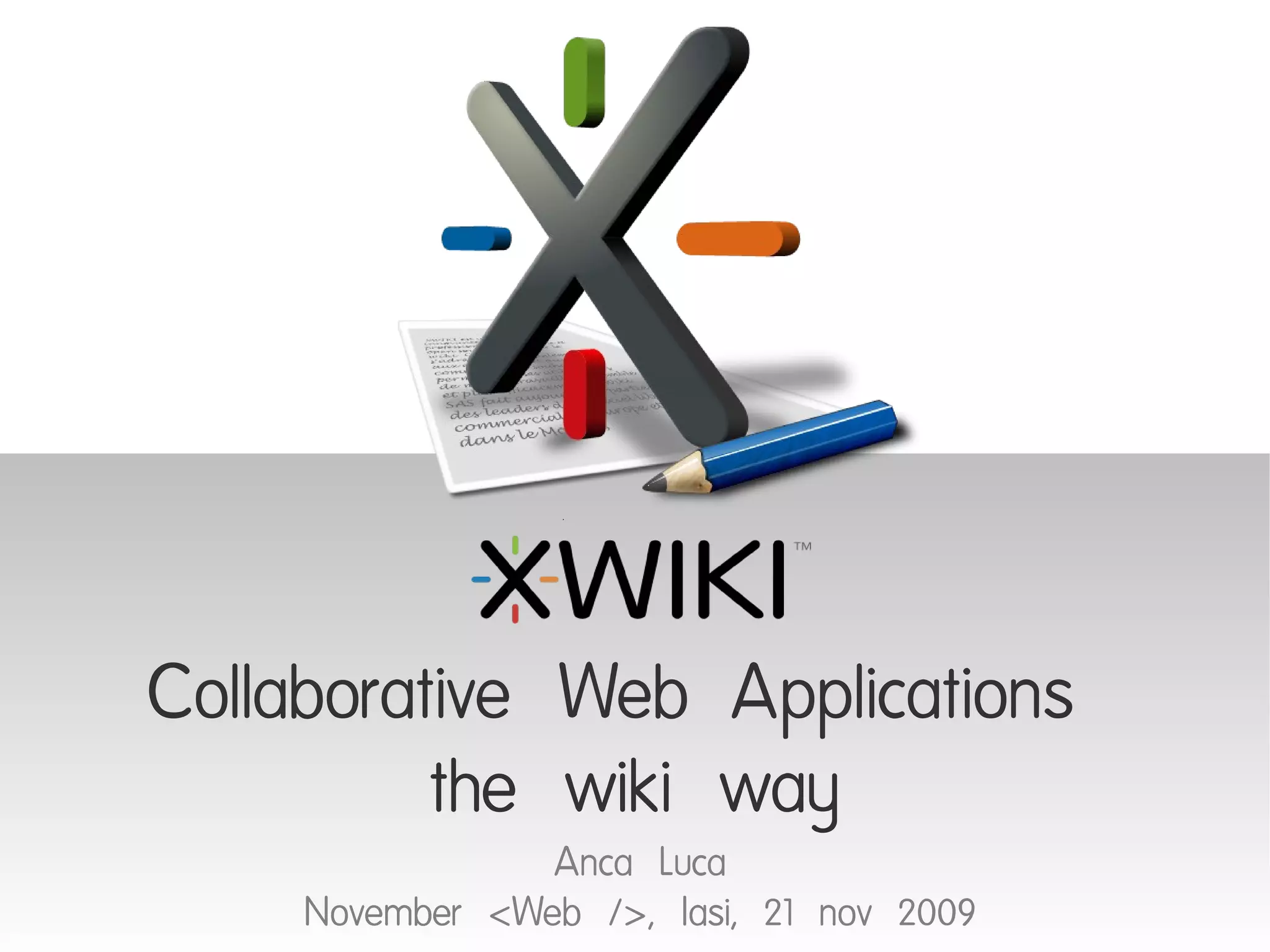 XWiki is an open source enterprise wiki platform that allows for collaboration on documents. It features organized document storage, advanced security and access controls, support for multiple languages and content types, and a customizable interface. As a wiki application platform, it also provides tools for creating custom applications within XWiki like blogs, forums, and task managers through scripting and extensions.