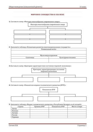 Документ включает задания для 11 класса по обществоведению, направленные на изучение многообразия современного мира и состояния мировой экономики. Студенты должны составить схемы и заполнить таблицы, отображающие концепции многонациональных государств и показатели индекса человеческого развития. Основное внимание уделяется сравнительному анализу Беларуси с соседними странами.