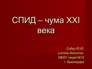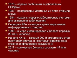 Документ посвящен проблеме СПИДа, описывающей его историю, пути передачи ВИЧ и статистику заражений. Указывается на способы профилактики и способы, которыми вирус не передается. Также рассматривается символика борьбы с СПИДом и ее значение в обществе.