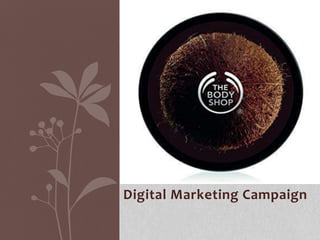 The document outlines The Body Shop's digital marketing campaign targeting women aged 18-35 and 35-55. The campaign will use social media platforms like Facebook, Twitter, and YouTube to reach both audiences over six months at an estimated cost of $50,000 per month. Key performance indicators will track followers, likes, comments, and video views to measure the campaign's success in further growing the brand's reach through digital marketing.