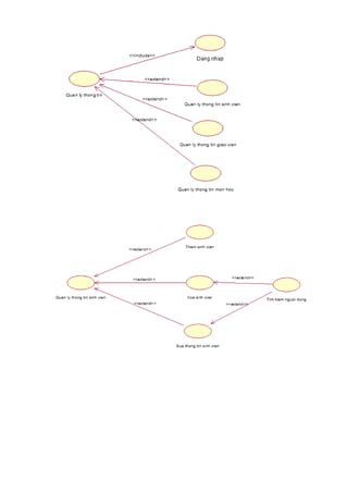 Tài liệu tập trung vào việc xây dựng các biểu đồ use case và biểu đồ lớp phân tích. Nó bao gồm các phân rã cụ thể cho các use case như chọn môn học, yêu cầu lịch phân công, đăng ký môn học, xem thời khóa biểu và quản lý thông tin. Các biểu đồ này nhằm mục đích mô tả các chức năng và tương tác trong hệ thống.