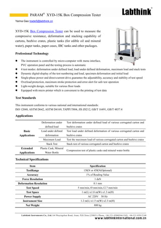 The XYD-15K box compression tester is designed to measure the compressive resistance, deformation, and stacking capability of various packages like cartons and plastic tanks. It features a micro-computer controlled interface, automatic testing, and complies with multiple international standards. Key specifications include a testing range of 15kN or 45kN with an accuracy of 1%, and a test speed of adjustable rates.