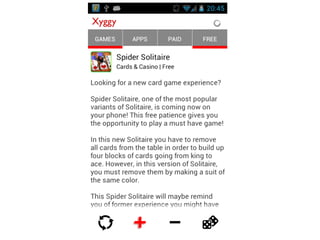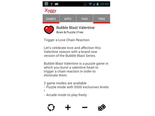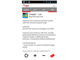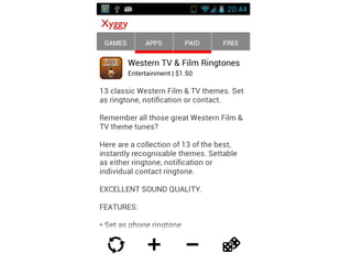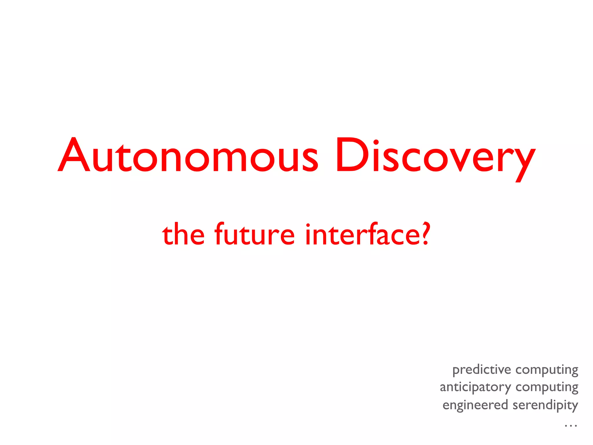 This document describes an autonomous discovery startup called Xyggy that uses machine learning algorithms to recommend new content to users without requiring explicit searches. It summarizes Xyggy's key features as autonomously discovering new games and apps for Android based on a user's preferences, interests they express by liking or disliking recommendations, and utilizing serendipity. The document also introduces the founder Dinesh Vadhia and his work with Professor Zoubin Ghahramani on Bayesian machine learning methods.