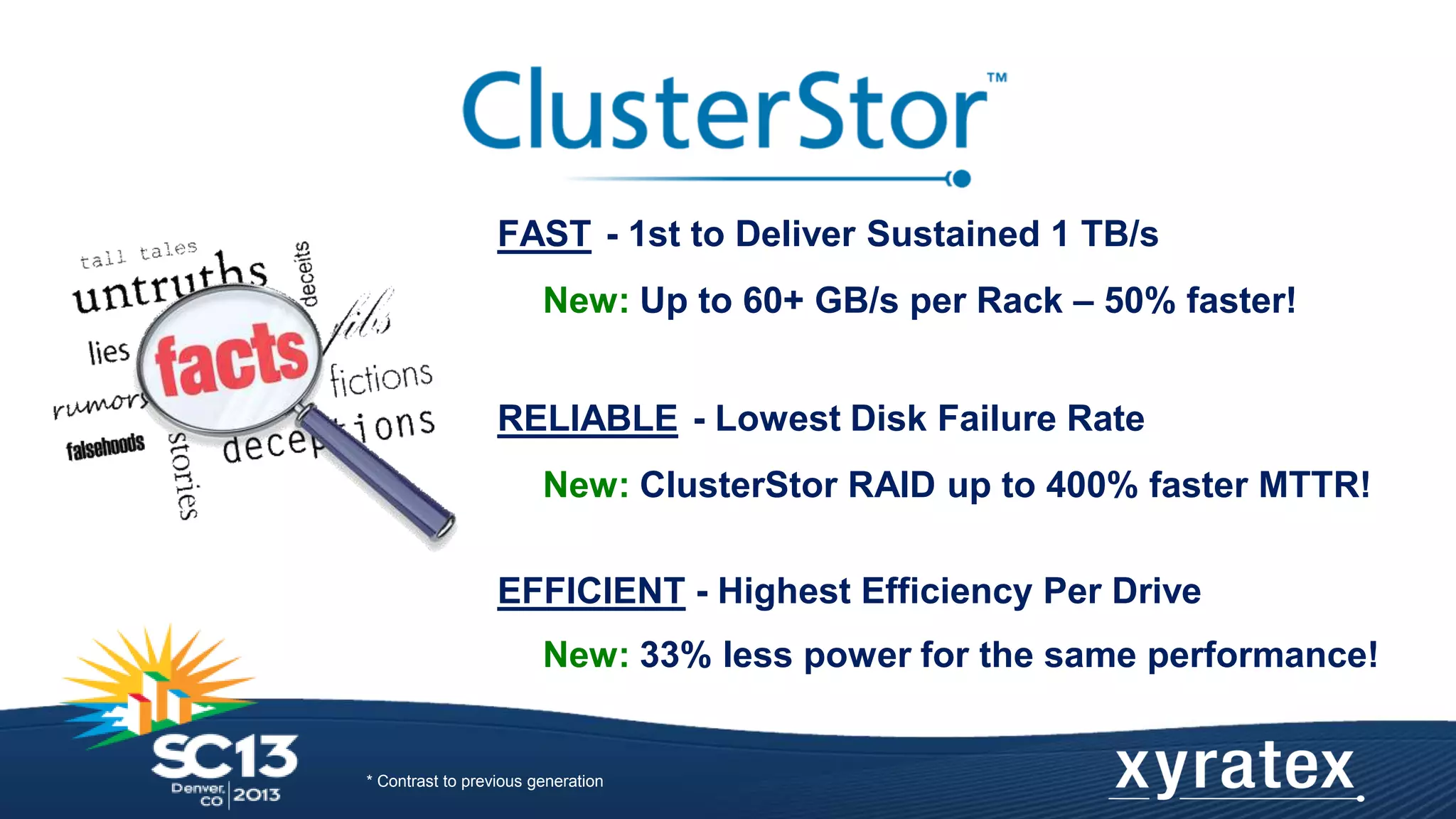 This document introduces new features of the ClusterStor 9000 storage solution that improve productivity for high-performance computing (HPC) and big data workloads. The key updates include a 50% performance increase over previous generations, new reliability features like ClusterStor RAID and T10 data integrity, and efficiency gains from technologies like flash acceleration and object storage consolidation. The ClusterStor 9000 is positioned as the engineered storage solution that delivers the fastest performance, most robust reliability, and highest efficiency to meet customer demands across industries like engineering, finance, and life sciences.