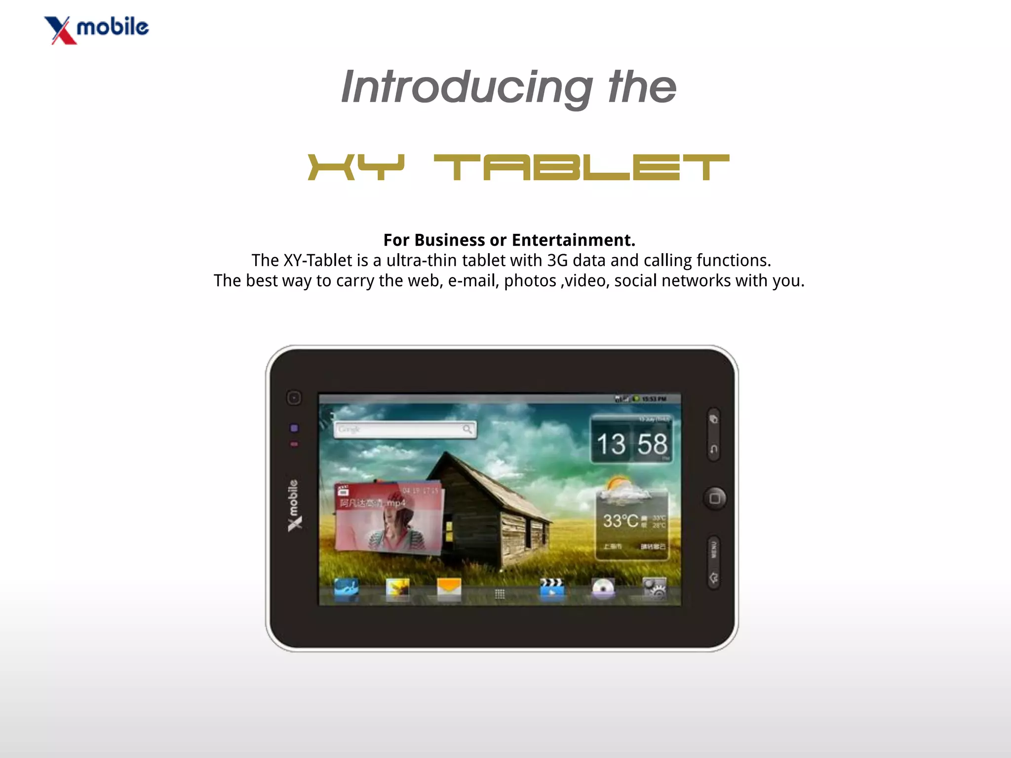 The XY Tablet is an ultra-thin 7-inch tablet with a 3G data and calling functions. It has a high-resolution touchscreen, supports WiFi and Bluetooth, and runs Android 2.2. The tablet allows users to access the internet, emails, photos, videos, and social networks. It also supports multimedia playback, productivity apps, and downloading games and apps from the Android Market.