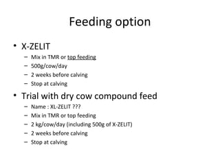 The document describes trials of a supplement called X-ZELIT given to dairy cows before and after calving on 4 farms. The supplement was mixed in feed or top-dressed and aimed to reduce health issues after calving like milk fever, displaced abomasum, and metritis. Results showed reductions in these issues on 3 of the farms and no problems with cow consumption. General observations found the supplement helped minimize health issues but did not clearly increase milk production, and it was difficult to administer to cows outside. Most farmers planned to continue using the supplement.
