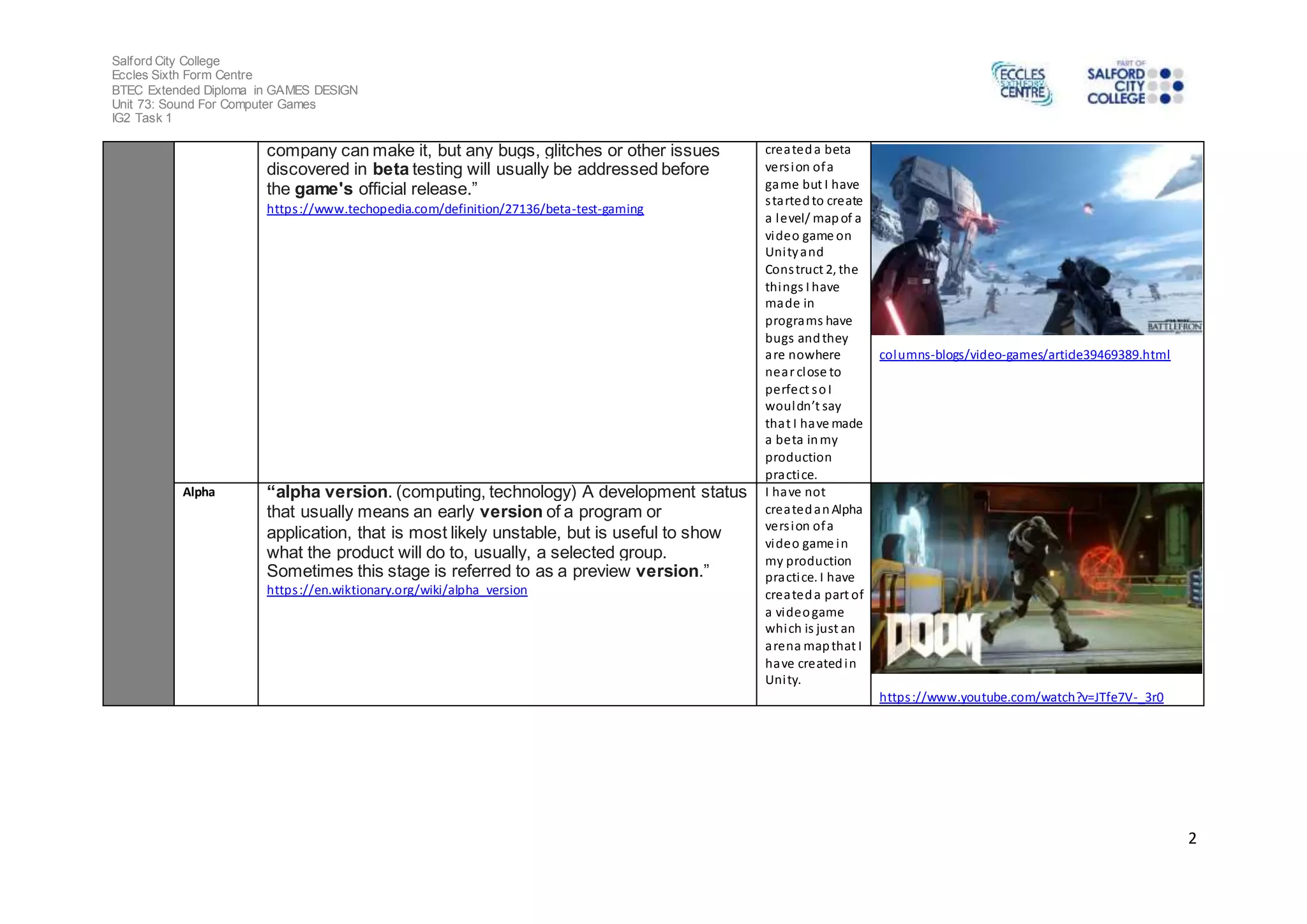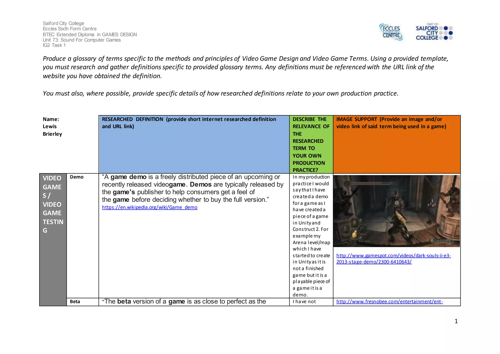 The document is a glossary created by a student for a games design course. It contains definitions for 12 terms related to video game development that the student researched online. For each term, the student provided the definition they found, the relevant URL source, and whether and how they utilized the term in their own game production work. The glossary covers terms such as alpha/beta testing, game engines, lighting, and anti-aliasing among others.