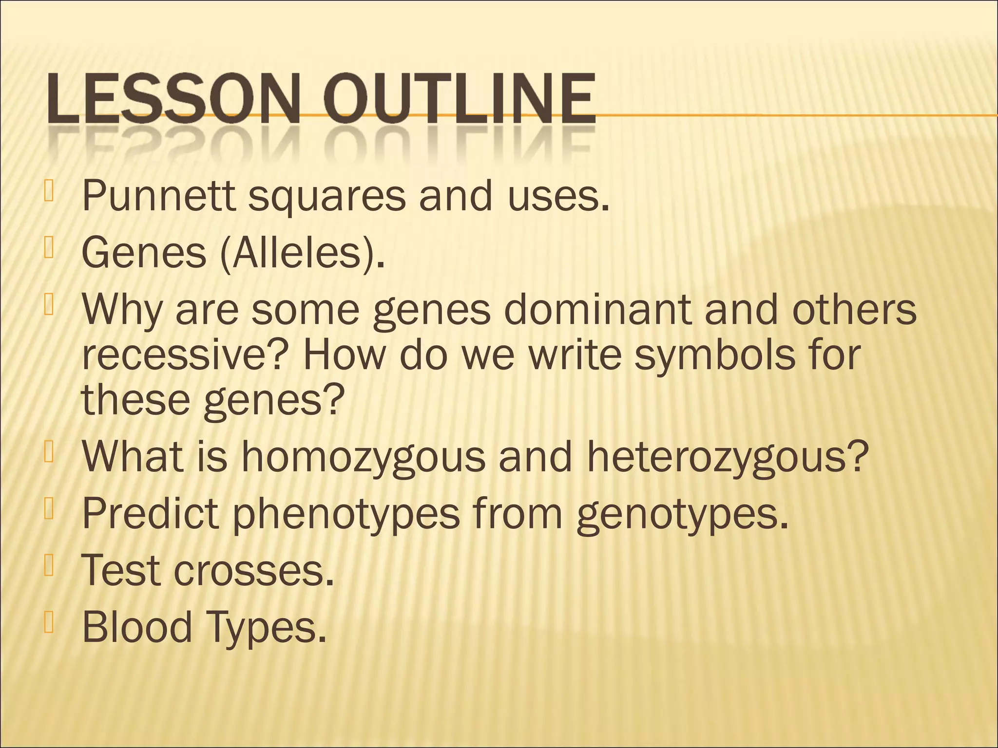 The document discusses basic genetics concepts including Punnett squares, dominance and recessiveness of alleles, and the significance of homozygous and heterozygous traits. It illustrates how traits like ear lobe shape and plant flower colors are inherited, as well as the influence of multiple alleles on traits such as blood type. Additionally, it emphasizes the interaction between genes and environmental factors in determining characteristics.