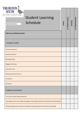 The document outlines a learning schedule for an OCR AS Level Media Studies course. It is divided into three sections: 1) covers foundation portfolio work including thriller conventions, audience research, and developing ideas; 2) focuses on audiences and institutions, addressing topics like media ownership, cross-media convergence, and new technologies; 3) examines TV drama through lenses like camerawork, editing, representation of gender, age, sexuality, ability, social class, region, and ethnicity. Students will complete tasks like blogging, editing videos, and case studies to build understanding before preparing for exams.