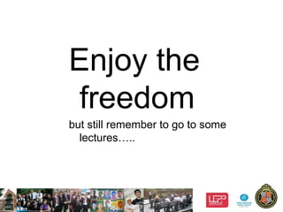 This document provides brief advice on various topics for students. Some key points covered are: enjoying freedom in university but still attending some lectures; practicing safe sex or abstinence; being brave by challenging prejudice; fighting poverty through taxation and fair wages rather than just charity; voting and using consumer power to campaign for change; pursuing purpose over wealth and fame; balancing confidence with humility; taking care of physical and mental health; traveling before responsibilities increase; maintaining family relationships; and thanking teachers.