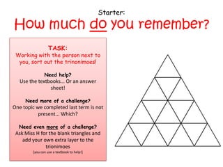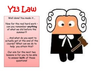 The document provides guidance and tasks for law students. It reminds students to review material from the previous term and sets out the goals for the next two lessons, which are for students to be able to discuss what they remember and what they want to achieve by the end of the course. It then provides students with tasks to complete in pairs or individually, such as sorting puzzles, answering questions, and considering legal cases, to help reinforce their learning.