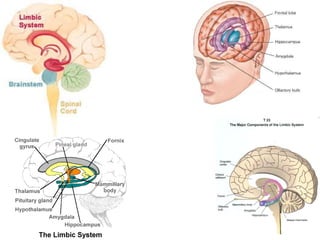 The document discusses physiology of memory and emotions, and the limbic system. It describes how memory involves processes of registration, retention, and retrieval. There are different types of memory including sensory memory, short-term memory, working memory, and long-term memory. Emotions are mental reactions that are subjectively experienced and accompanied by physiological and behavioral changes. The limbic system, including the hippocampus and amygdala, are brain areas responsible for memory and processing emotions.