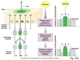 This document discusses the human sensory system, including sensory receptors, pathways, and cortex. It describes the different sensory modalities and sensations. The main sensory pathways are the dorsal column-medial lemniscus pathway and spinothalamic pathway, which transmit signals from receptors to the thalamus and sensory cortex. Within the cortex, different body regions are represented in a distorted map called a sensory homunculus. The document provides details on various mechanoreceptors, transduction of stimuli to action potentials, and coding of sensory information.