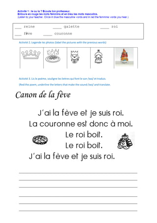 The document contains instructions for two activities in French. The first asks to label photos with previous words. The second asks students to read a poem, underline letters making the /wa/ sound, and translate the poem. The poem is six lines about a queen, cake, king, bean, and crown related to the Epiphany tradition of finding a bean in a cake.