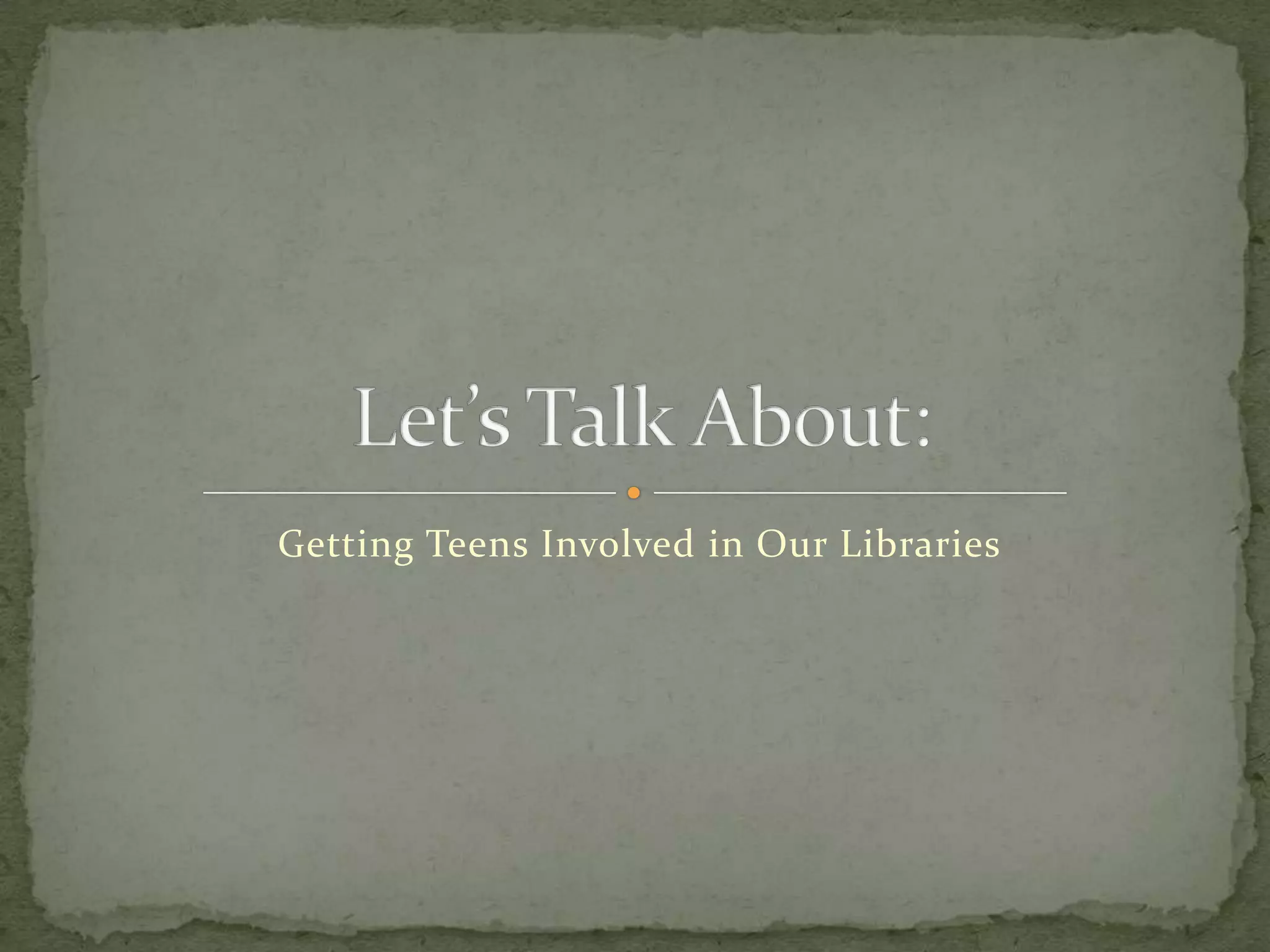 The document discusses strategies for involving teens in library activities by focusing on their interests and talents, planning engaging service projects, and fostering community partnerships. It provides a variety of ideas and resources, including online platforms for communication and social activism opportunities, to maintain their engagement. Additionally, it emphasizes the importance of collecting feedback from teens and adapting library programs to suit their evolving preferences.