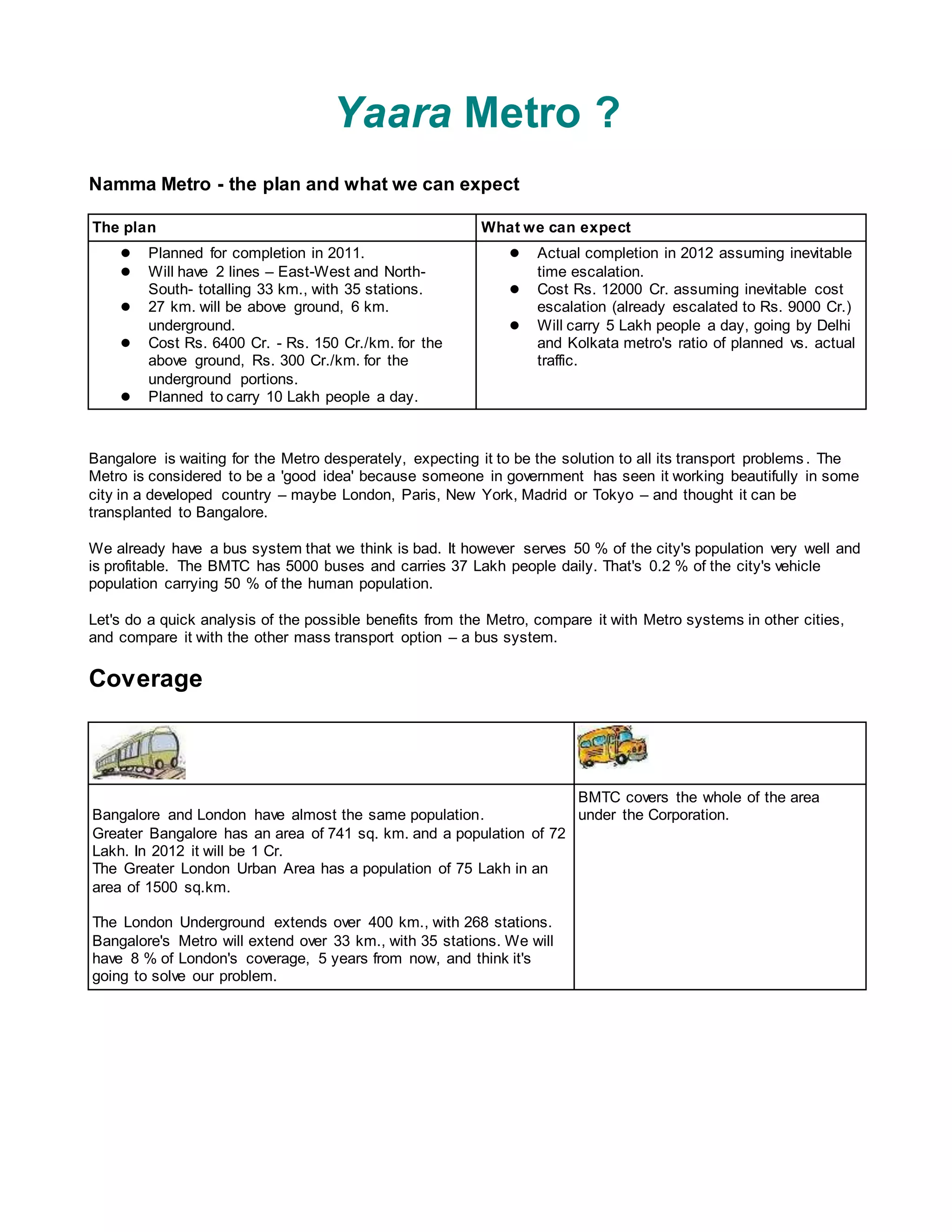 The document summarizes key differences between Bangalore's proposed metro system and improving the existing bus system. The metro will have limited initial coverage of just 33 km compared to London's 400 km system. It will be very expensive, costing over 100,000 crore rupees to achieve similar coverage as London. In contrast, improving bus services could provide city-wide coverage much more quickly for only 2,500 crore rupees. The metro also risks significant environmental damage by requiring elevated tracks, unlike other metro systems that are mostly underground.