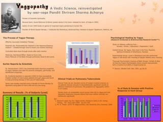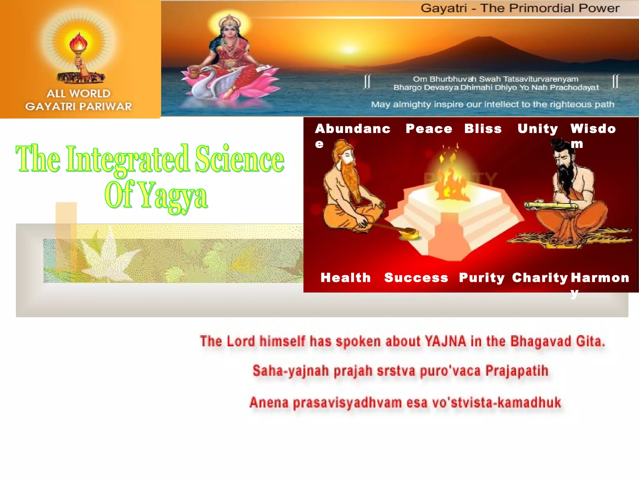 This document provides information on the ancient Vedic practice of yagya (homa/havan/fire sacrifice) including its definition, importance, benefits, and historical significance according to Vedic scriptures. It discusses yagya from scientific, social, and subtle perspectives and provides case studies showing positive impacts on the environment, health, agriculture, and disasters. International organizations propagating yagya and contacts are listed. The conclusion is that yagya is a comprehensive solution to problems according to the Vedas and should be spread worldwide to help the environment and humanity.