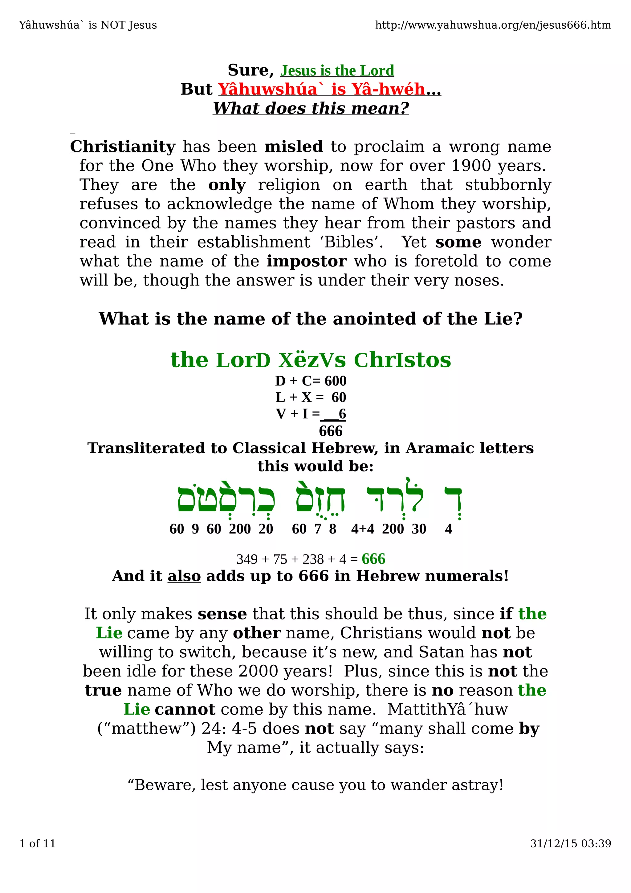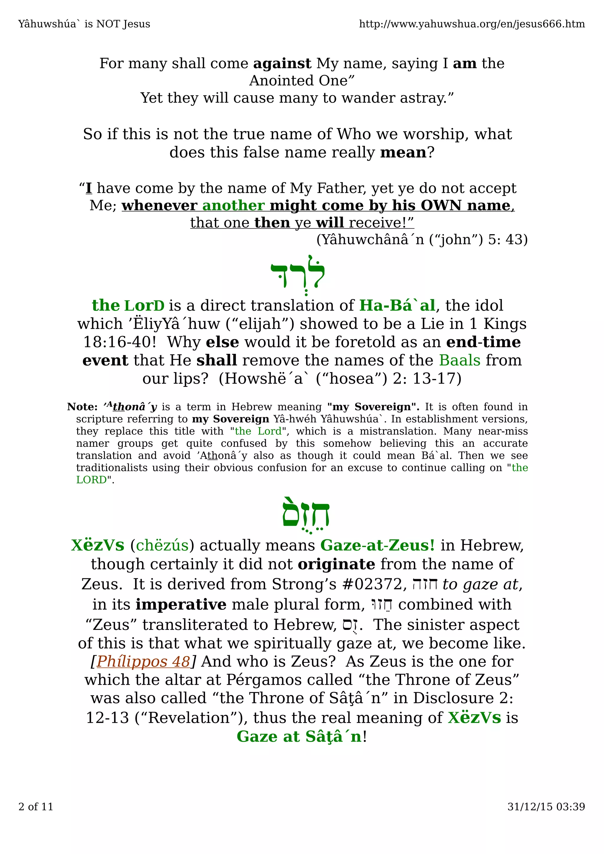 This document discusses how Christianity has misused the name of God and Jesus for over 1900 years by using names like "Lord" and "Jesus" instead of their original Hebrew names, Yahweh and Yahushua. It analyzes how the name "Jesus" translates to "Gaze upon Zeus" in Hebrew and adds up to 666 in various languages. It argues the true name of God is Yahweh and the Messiah's name is Yahushua, as found in original Hebrew scripture. The document seeks to correct the widespread misunderstanding and intentional distortion of their true names throughout history.