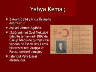 Yahya Kemal; 2Aralık 1884 yılında Üsküp’te doğmuştur. Asıl adı Ahmet Agâh’tır. İlköğrenimini Özel Mekteb-i Edep’te tamamladı.1892’de Üsküp İdadisine girmiştir.Bir yandan da İshak Bey Camii Medresesi’nde Arapça ve Farsça dersleri almıştır. İstanbul Vefa Lisesi mezunudur.