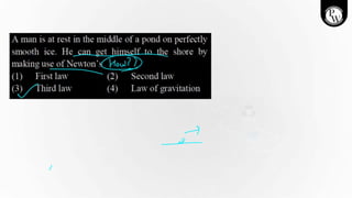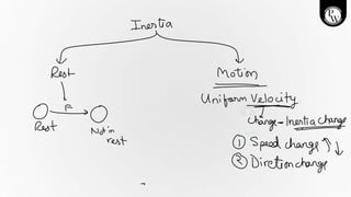 The document discusses Newton's laws of motion. It explains that Newton's first law states that an object at rest stays at rest and an object in motion stays in motion with the same speed and in the same direction unless acted upon by an unbalanced force. The second law addresses the relationship between an object's mass, its acceleration, and the net force acting on the object. The third law involves action-reaction pairs of forces between interacting objects.