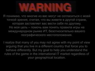 The document discusses essential strategies for aspiring Java developers to navigate the international IT job market, regardless of their geographical location. It covers topics such as job searching, cultural differences, contractor vs. employee dynamics, and the importance of continuous skill development. Additionally, it emphasizes the significance of maintaining confidentiality around salary and the nuances of presenting oneself professionally online.