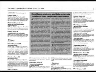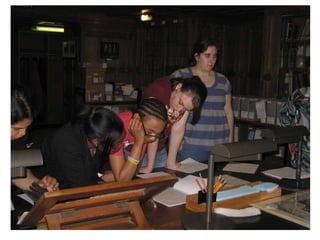The document summarizes a project between Yale University archivists and local high school students to introduce students to the archival profession. Over the course of 8 weeks, archivists from Yale worked with 650 high school students, most of whom were students of color or had English as a second language. The project included lessons, a tour of archival facilities, and a final project. While aspects like collaboration and achieving educational goals worked well, longer timelines and ensuring teacher support were challenges. Feedback from teachers suggested focusing lessons into one intensive week to better engage students.