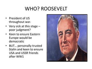 The Yalta Conference in February 1945 brought together the leaders of the United States, United Kingdom, and Soviet Union to plan for the post-war world as World War II continued. There was a focus on Poland, as Stalin wanted to ensure it became communist and friendly to the USSR, while Churchill and Roosevelt wanted it to be democratic. Roosevelt was ill and trusted Stalin, while Churchill distrusted Stalin and was worried about Soviet influence spreading across Eastern Europe. Poland was important because it was the largest country in Eastern Europe and there were competing Polish governments-in-exile that had different views on Soviet control.