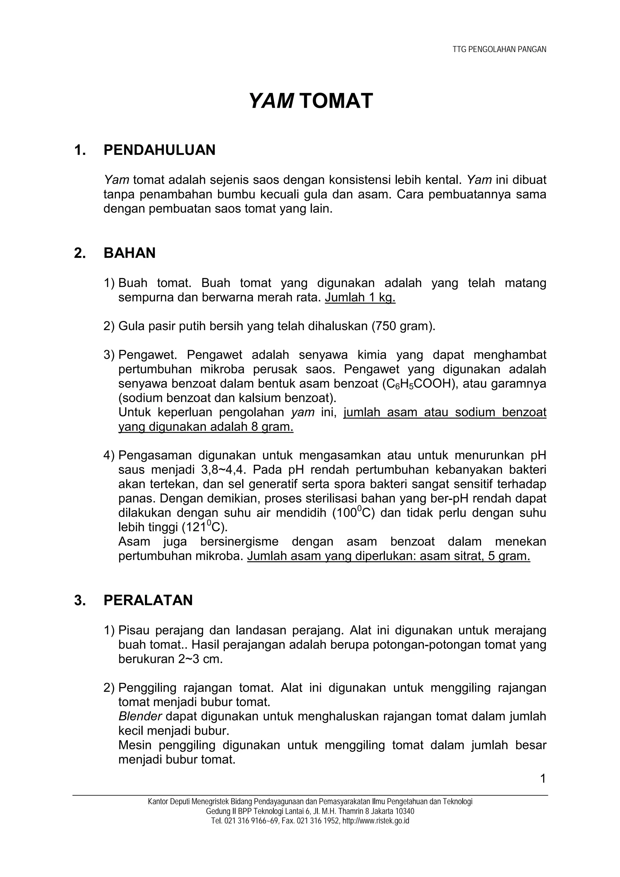 Dokumen ini memberikan panduan cara pembuatan yam tomat dengan menggunakan bahan baku tomat yang dihaluskan, gula, asam sitrat, dan asam benzoat. Langkah-langkah pembuatannya meliputi pengolahan tomat menjadi bubur, penambahan bumbu, memasak hingga mengental, pengemasan ke dalam botol kaca, sterilisasi, dan penyegelan.