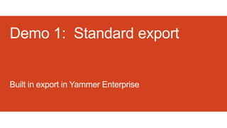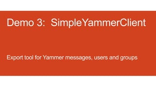 This document discusses social data mining from Yammer networks. It provides instructions for network administrators to export Yammer data which includes admins, files, groups, messages, networks, pages, topics and users. It also discusses building applications using the Yammer APIs, which allow accessing this data through REST API endpoints. Finally, it presents examples of processing and analyzing the exported social data for insights, as well as visualizing the results.