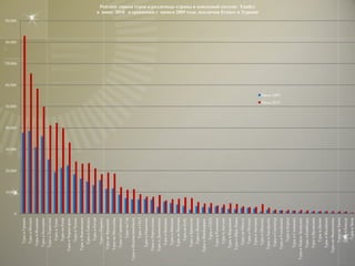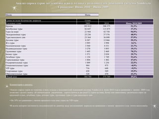 Документ представляет собой анализ спроса на туристические направления среди пользователей поисковой системы Яндекс в июне 2010 года, с данными о динамике изменений по сравнению с предыдущими периодами. Основное внимание уделяется популярности таких стран, как Турция, Египет и Греция, а также изменению интереса к различным видам отдыха и курортам в России. В документе также подчеркивается рост заинтересованности к другим странам и увеличение общего количества запросов по сравнению с предыдущими годами.