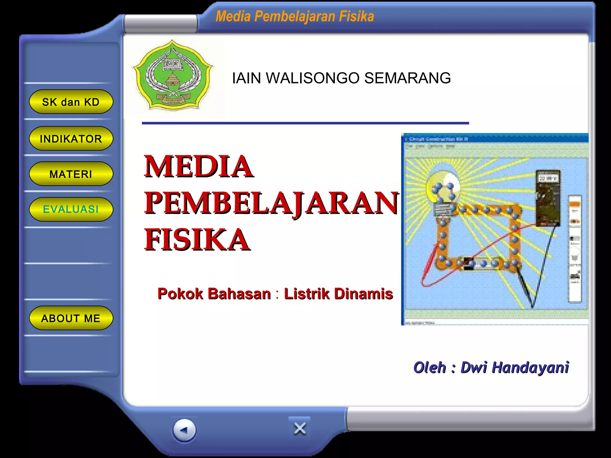 Dokumen tersebut membahas tentang materi listrik dinamis yang mencakup pengertian arus listrik, beda potensial, hukum-hukum Kirchhoff, hubungan antara tegangan dan arus berdasarkan hukum Ohm, serta contoh soal latihan. Materi disajikan dengan gambar diagram rangkaian dan rumus-rumus dasar untuk memahami konsep listrik dinamis dan penerapannya dalam kehidupan sehari-hari.