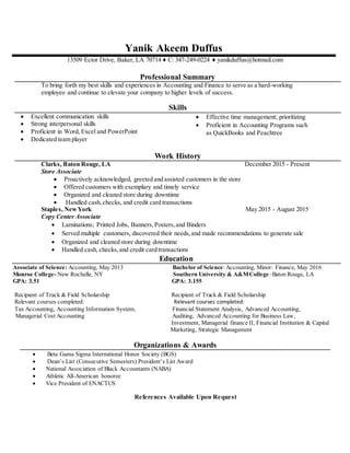 Yanik Duffus is seeking an accounting or finance position where he can utilize his skills. He has a bachelor's degree in accounting and finance from Southern University & A&M College with a 3.155 GPA. His work history includes positions as a store associate at Clarks and a copy center associate at Staples where he provided excellent customer service and handled cash transactions. He is proficient in accounting programs like QuickBooks and Peachtree as well as Microsoft Office applications.
