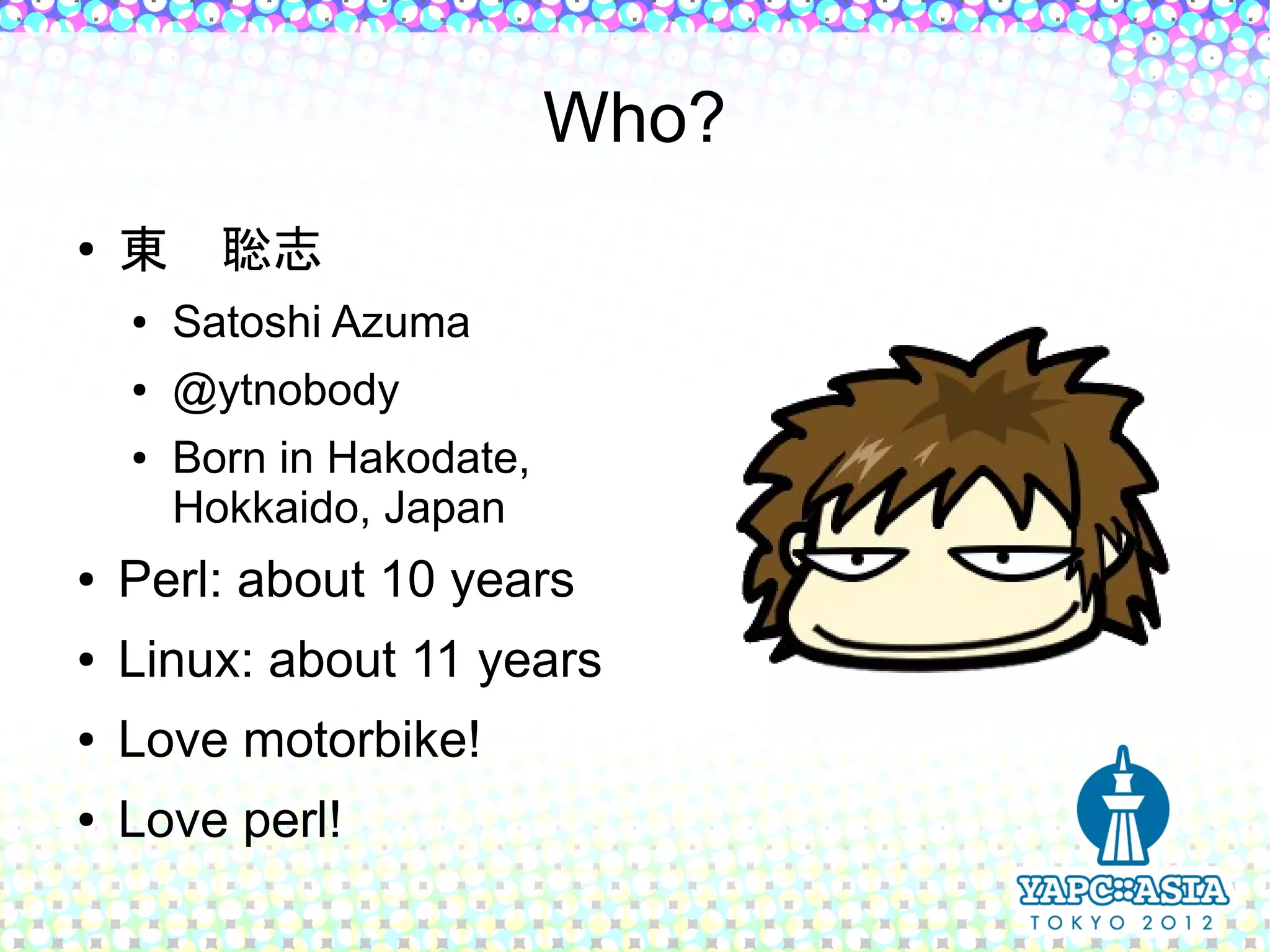 勉強会(小さくてもOK) ● Hachioji.pm ● Niigata.pm ● Perl入学式 ● Hokkaido.pm Casual ● Perl Beginners – ↑主宰をやっております ● お気に入りのモジュールを宣伝してこよう ● 誰かのお気に入りモジュールを使ってみよう
