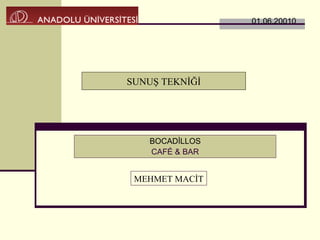 ÜRÜN ÖZELLİĞİ VESERVİSİ Mekanın Özellikleri Konsept nedeniyle latin müzikleri eşliğinde hizmet vericek olması , Giriş texas kapı yapısında tahtadan olucaktır , otantik ortam oluşturucaktır , Mekan duvarları flamenko şarkıcılarının tablolarıyla süslenmiştir , Mutfak bölümünün cafenin içinden görülebilmesi , ( müşterilerin yiyeceklerin nasıl hazırlandığını görmeleri ve içlerini rahatlatmak açısından önemlidir ) Bar kısmının her zaman gösteri durumunda bulunması Sigara içen müşteriler için dışarıda da servis sunulması . Etkinlik günleri düzenlenmesi , bunlara uygun fiyatlar düzenlenmesi . Kablosuz internet özelliği , Uygun park yeri .