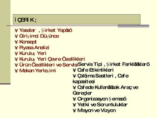 İÇERİK ; Yasalar , Şirket Yapısı Gi rişimci Düşünce Konsept Piyasa Analizi Kuruluş Yeri Kuruluş Yeri Çevre Özellikleri Ürün Özellikleri ve Servisi Mekan Yerleşimi Servis Tipi , Şirket Farklılıkları Cafe Etkinlikleri Çalışma Saatleri , Cafe kapasitesi Cafede Kullanılıcak Araç ve Gereçler Organizasyon Şeması Yetki ve Sorumluluklar Misyon ve Vizyon