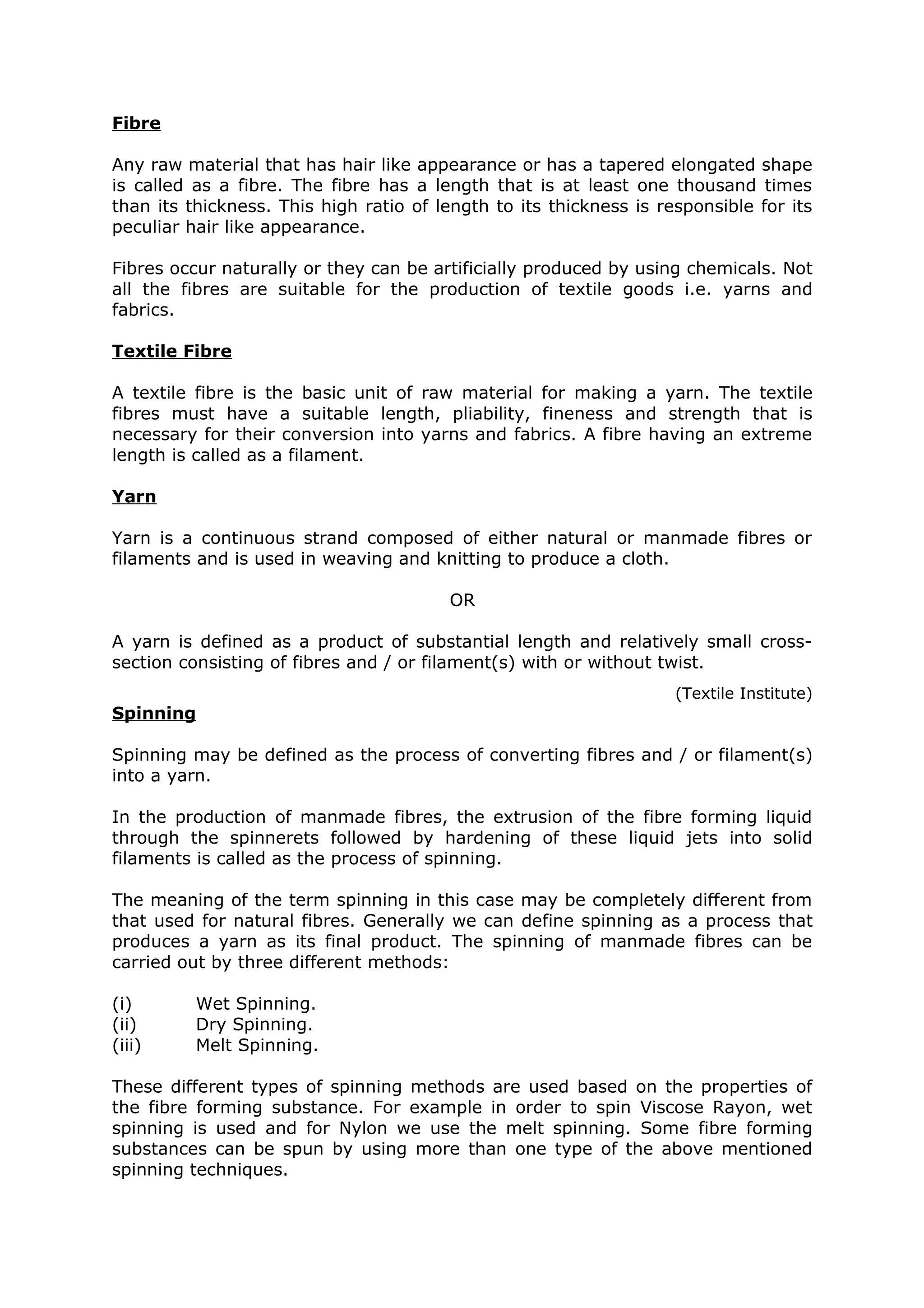 Fibre is any raw material that has a hair-like appearance or elongated shape due to its high ratio of length to thickness. A textile fibre must have suitable length, pliability, fineness and strength for conversion into yarns and fabrics. Yarn is a continuous strand composed of natural or manmade fibres or filaments used for weaving and knitting. Spinning is the process of converting fibres into yarn, which can be done through wet, dry or melt spinning depending on the fibre properties. Fibre properties like staple length, fineness and strength influence spinning and the properties of the final yarn.