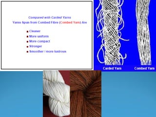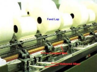 The document discusses combing preparatory processes. It describes the need for combing preparatory, which includes fiber straightening, reversing fiber flow, and producing a flat sliver. Traditionally, this involved a sliver lap machine and ribbon lap machine, but now mostly uses a draw frame and sliver lap machine. The objectives of combing preparatory are to straighten fibers, reverse flow, maximize leading fiber hooks, and produce a flat sliver. Different machine types and their functions are explained, including parameters that influence the combing operation and quality of the finished product.