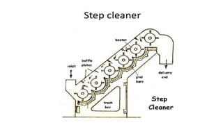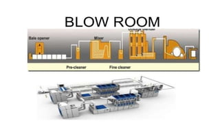 This document provides information about various machines used in the spinning section of textile engineering. It includes flow charts that outline the processes and machines used to produce carded, combed, and rotor yarns. Key machines discussed include blow room, carding, draw frame, and ring frame. It also covers bale management, mixing, blending, ginning, and the functions of blow room and carding machines.
